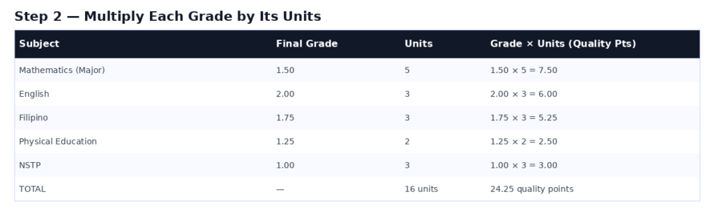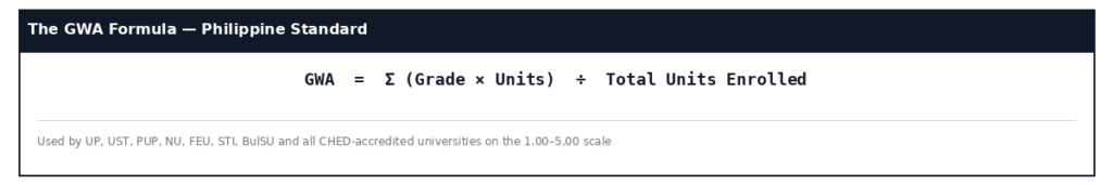 GWA = Sum of (Grade × Units for each subject) ÷ Total Units Enrolled. Multiply each subject’s final grade by its credit units, add all products, divide by total units enrolled. This is the standard formula used by all CHED-accredited Philippine universities on the 1.00–5.00 numerical scale.