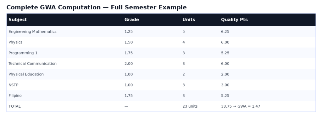 Result: GWA of 1.52 Magna Cum Laude range (87–92%). Mathematics with 5 units contributed 7.50 quality points out of 24.25 total nearly one-third of the entire GWA from a single subject. This is why high-unit major subjects have the most impact on your GWA.