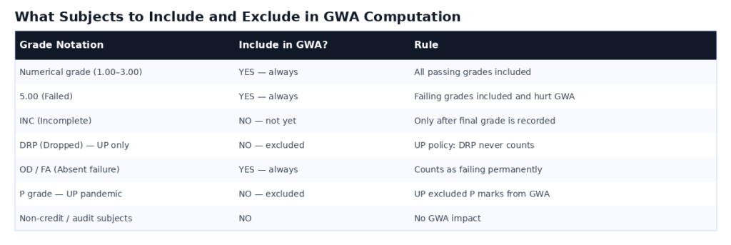 Include EVERY subject with a final numerical grade major subjects, minor subjects, PE, NSTP, theology, ROTC, and all electives. The only valid exclusions are DRP (UP only), unresolved INC, and officially designated non-credit subjects.Most important rule: