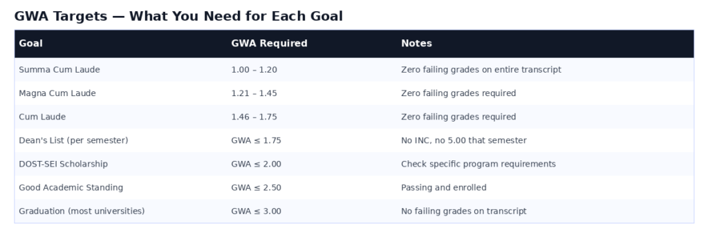 | Graduation (most universities) | GWA ≤ 3.00 | No failing grades on transcript |